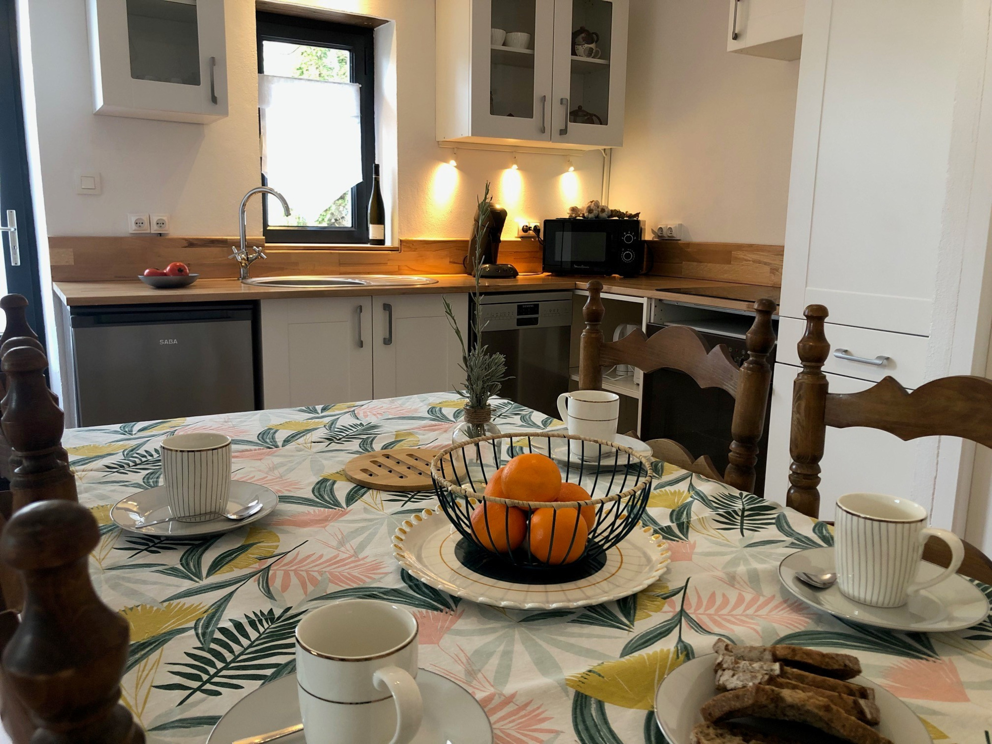 Découvrez la cuisine du gîte L’Épicurieux à Chonas-l’Amballan : tout équipée et baignée de lumière, elle est pensée pour partager des repas conviviaux en couple, entre amis ou en famille. La table à manger invite à savourer des petits-déjeuners ou des dîners autour de vins locaux, dans une ambiance chaleureuse et accueillante