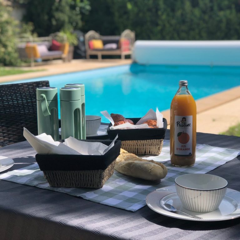 Savourez un petit-déjeuner 100 % fait maison aux Loges de Bacchus : pain et croissants frais, confitures et yaourts maison, fruits locaux et café en grain, à déguster en famille au bord de la piscine ou dans les gîtes.